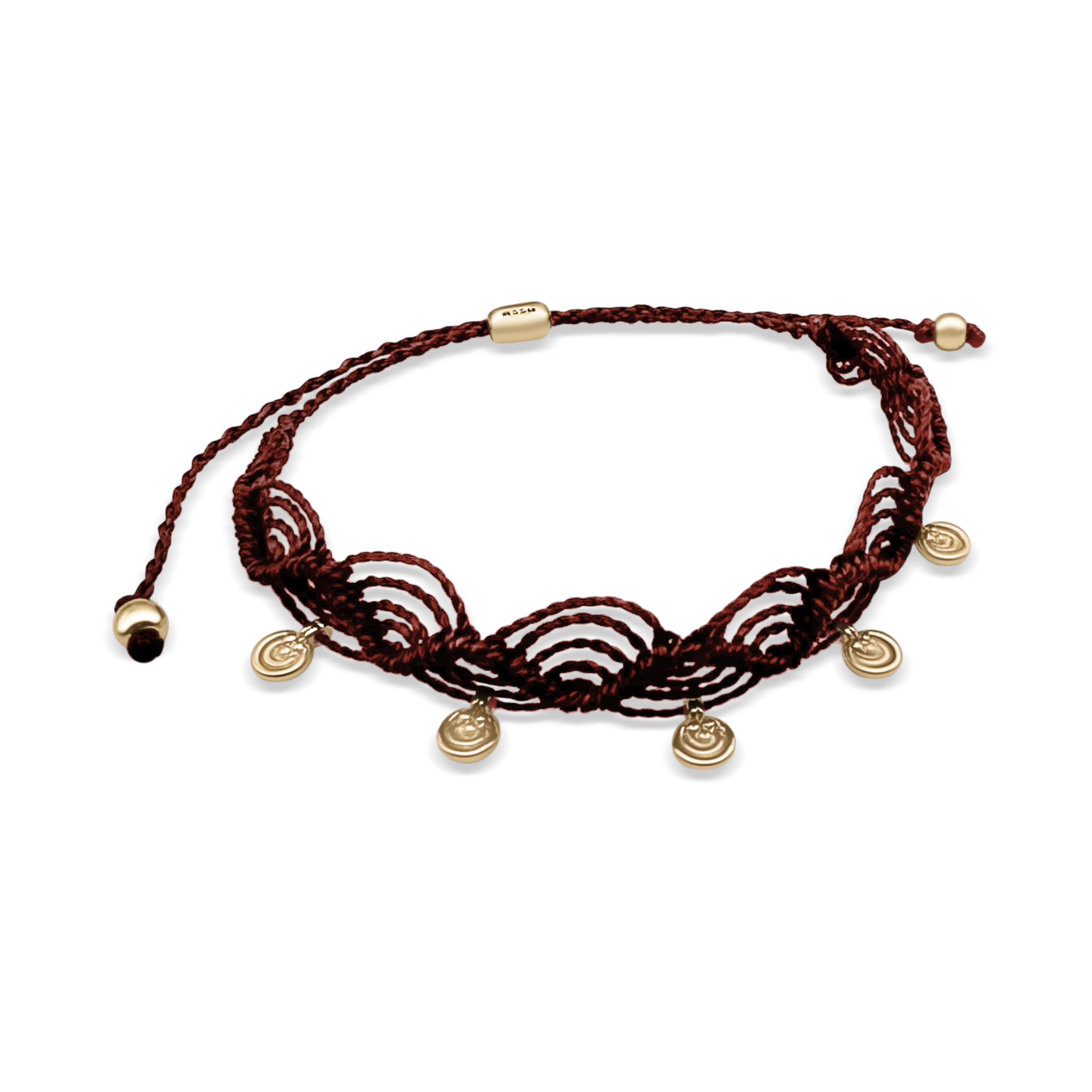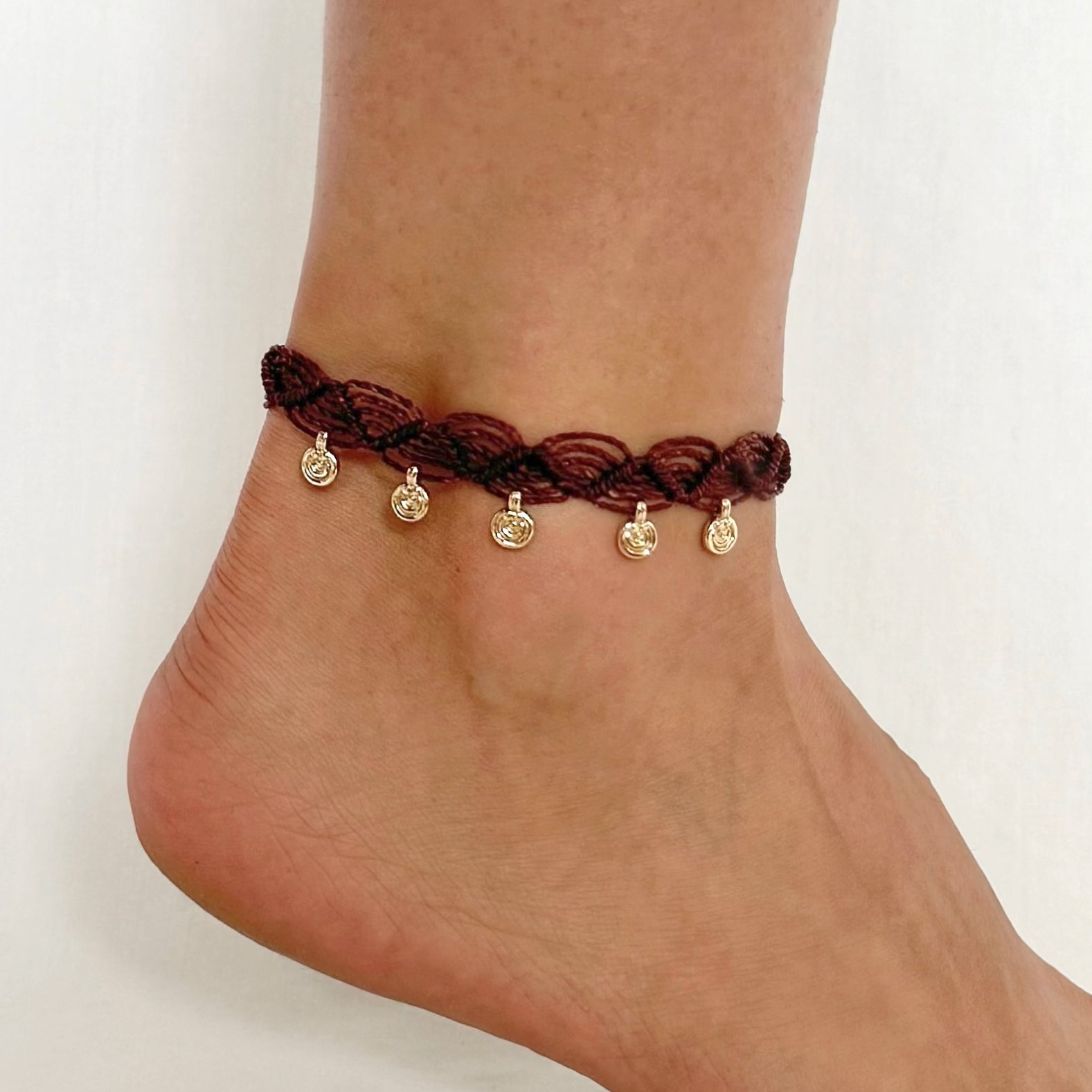 An intricate handwoven macramé anklet accented with delicate 14k gold plated charms that add subtle movement and shine. An easy-to-adjust silicone sliding extender allows for a comfortable, customizable fit.