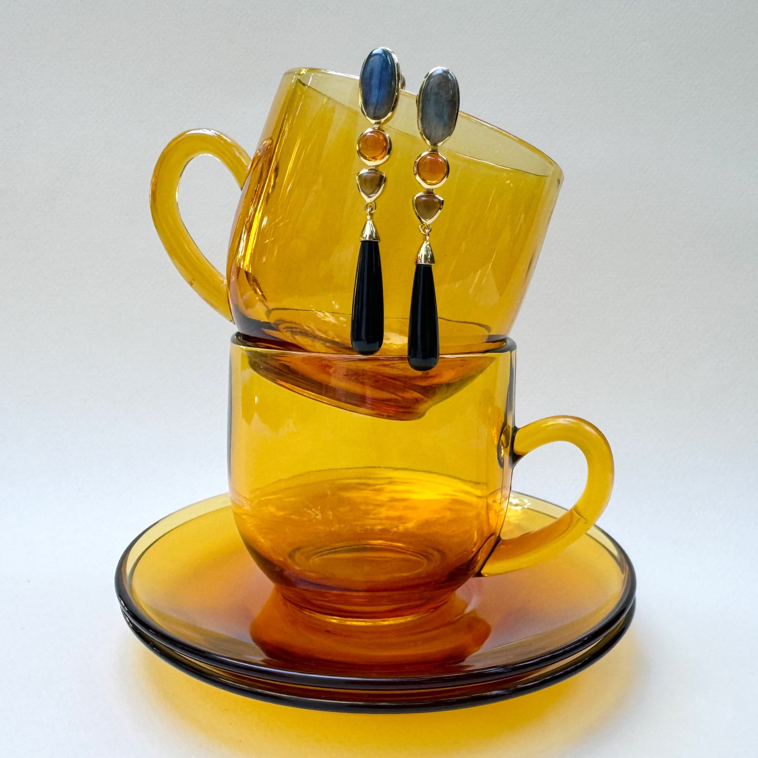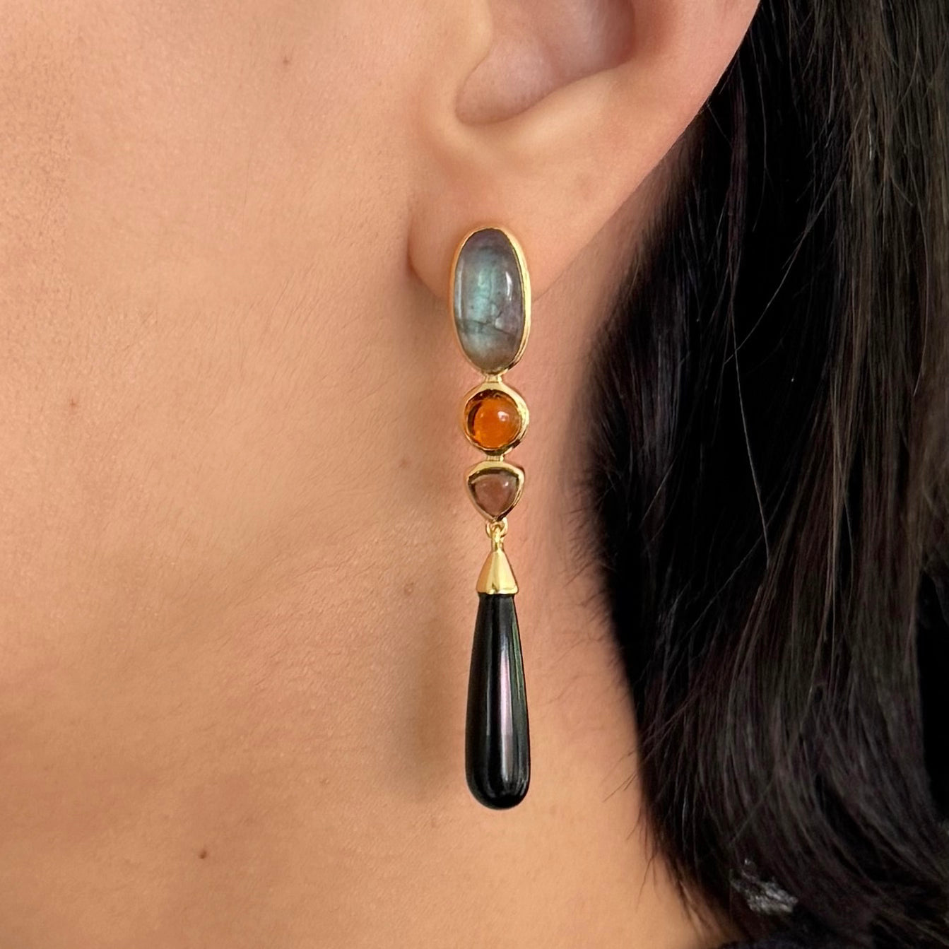 Exploring contrast through form and tone, the Cueva Drop Earrings pair soft drop shapes with angular stones in labradorite, smoky quartz, beer quartz, and black onyx. Cool blues and warm ambers sit side by side, creating balance and quiet tension. Comes with oversized silicone-sliding backs for added support and comfort.