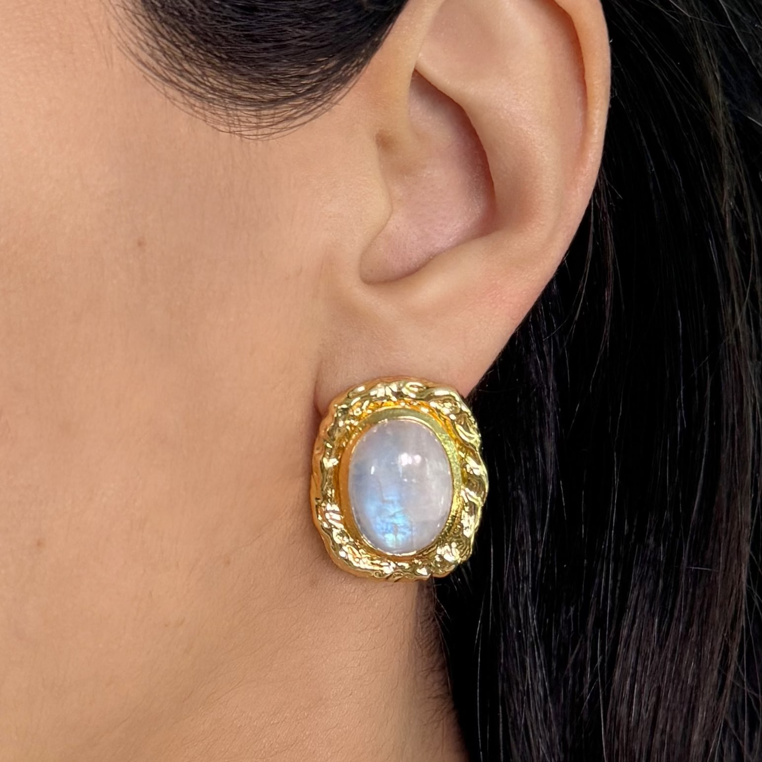 These rainbow moonstone studs feature luminous stones with metallic blue undertones, set in a classic gold frame. Understated and romantic, they’re designed to feel timeless and considered. Comes with oversized silicone-sliding backs for added support and comfort.