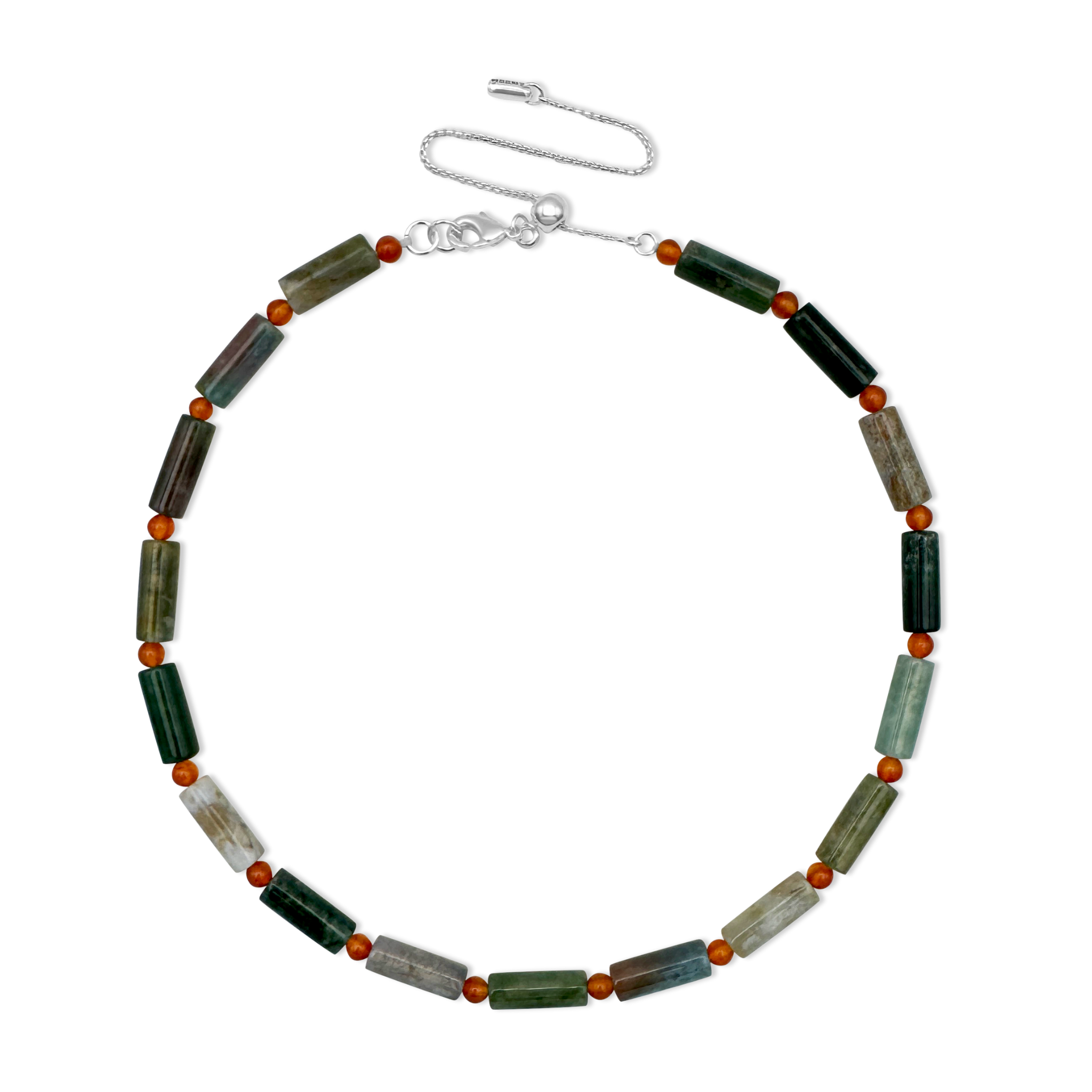 This handmade necklace features earthy Indian Agate and warm Carnelian beads, offering an easy pop of color that pairs well with natural tones and casual or elevated styling. An easy-to-adjust silicone sliding extender makes it effortlessly versatile and perfect for layering with other necklaces or chains.